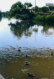 To know the Don, you must go down to the river. That wasn't always easy to do, but now there's a stairway at the Queen Street bridge, and a few other bridges beyond. Step down and you're in another place: more relaxed than the street (though you can still hear streetcars); its time slower, its space more expansive if gently bounded, the river riding calm between banks bushed and treed. It's not entirely bucolic. In places those banks are steel retaining walls, driven deep to hold the river to a course made by man -- here dead straight. In others, even mid-river, it's concrete -- footing massive pillars holding expressway ramps high overhead. It can feel awe-ful, mysterious, vaguely unsettling. Even a bit creepy. Or -- as beauty more fearsome than cute has been called -- sublime. Ducks ripple the river; Canada Geese, in season, ripple more. They don't flee your presence but paddle up: they're urban fowl, the ducks anyway; like city squirrels they expect humans to toss treats. (I did: fair exchange for a picture.) Down here you can forget there's a city up there -- for a moment. Listen; look along the river to buildings, highway signs, bridges: it's there. And you are still there. This, too, is the city. And, I must admit, I haven't used those stairs often, an urban wanderer apt to ignore the valley (but for the view), traversing what can feel a flat cityscape -- even on streets sailing high over green earth and gleaming water below. It is, very much, a Toronto thing: this is a city of ravines. As Bob Fulford said in Accidental City, "The ravines are to Toronto what canals are to Venice and hills are to San Francisco. ... There's nothing quite like them anywhere else. No other big city has so much nature woven with such intricate thoroughness through its urban fabric." I have known a few ravines, some well enough to negotiate in the dark. You can tour David Balfour Park, carved by a tributary of the Don, in a memoir here; a link below leads to it. The wonders I found there (not counting those unintended by city fathers) were echoed by Anne Michaels in her 1996 novel Fugitive Pieces. I quoted from it there, and will again (reiterating a line above).